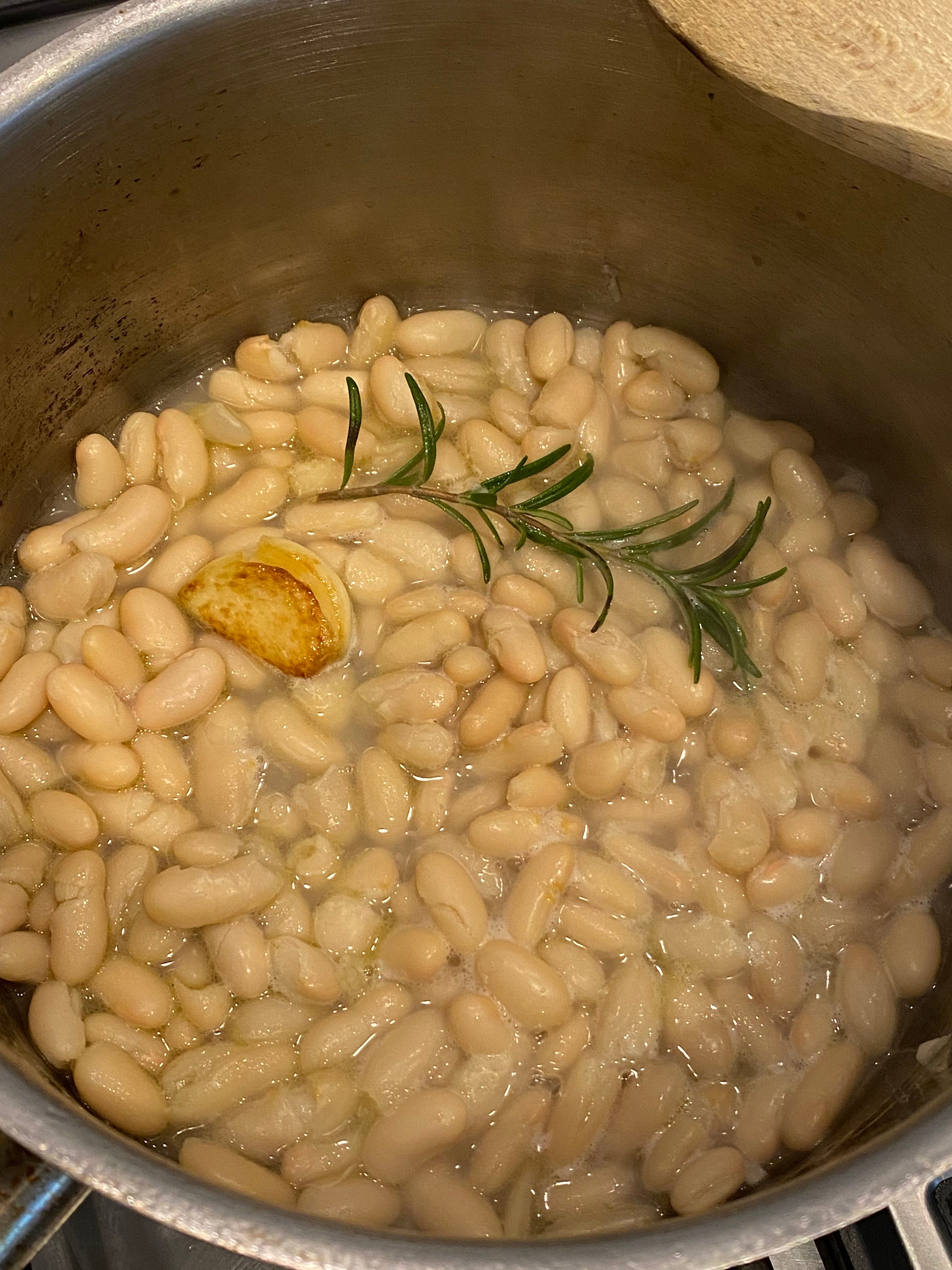 Once the garlic has sizzled gently for a minute or so and turned lightly golden on both sides, add your stick of rosemary and pour in your beans + the liquid from the jar. It should look roughly like the picture below, add a splash of water if they don’t have enough liquid.