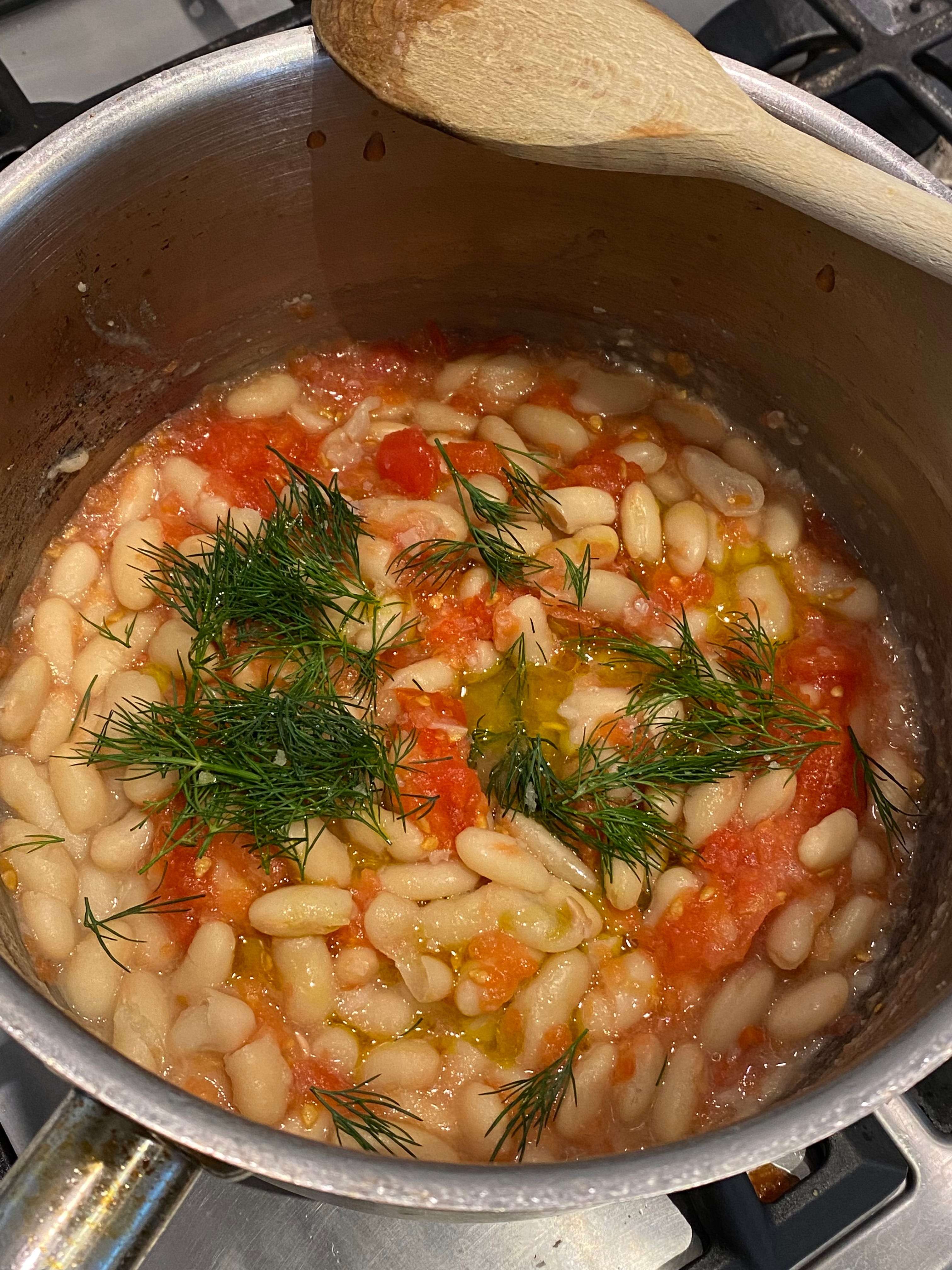 Leaving the beans to bubble very gently on a low heat, use a box grater to grate your tomatoes into a bowl. Transfer the tomatoes and their juices to the beans along with the dill, a good glug of olive oil and a big pinch of salt and simmer for another couple of minutes. You want the resulting texture to be saucy. Not soupy and not dry but somewhere in the middle.