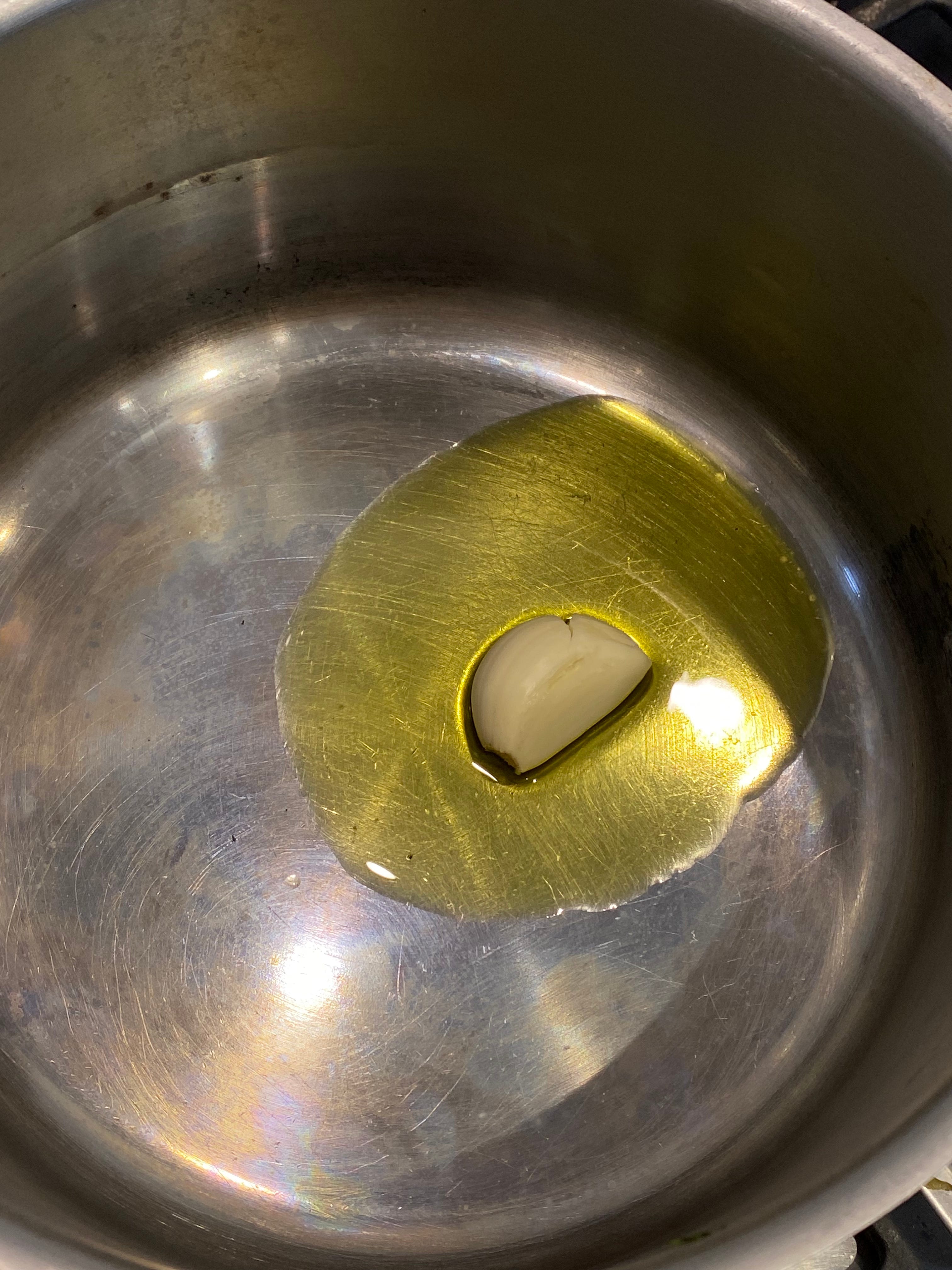 Press the flat side of your knife against the clove of garlic and push with your palm to crush a little. Peel and add to the oil (it should be slightly crushed open but not completely smashed apart).