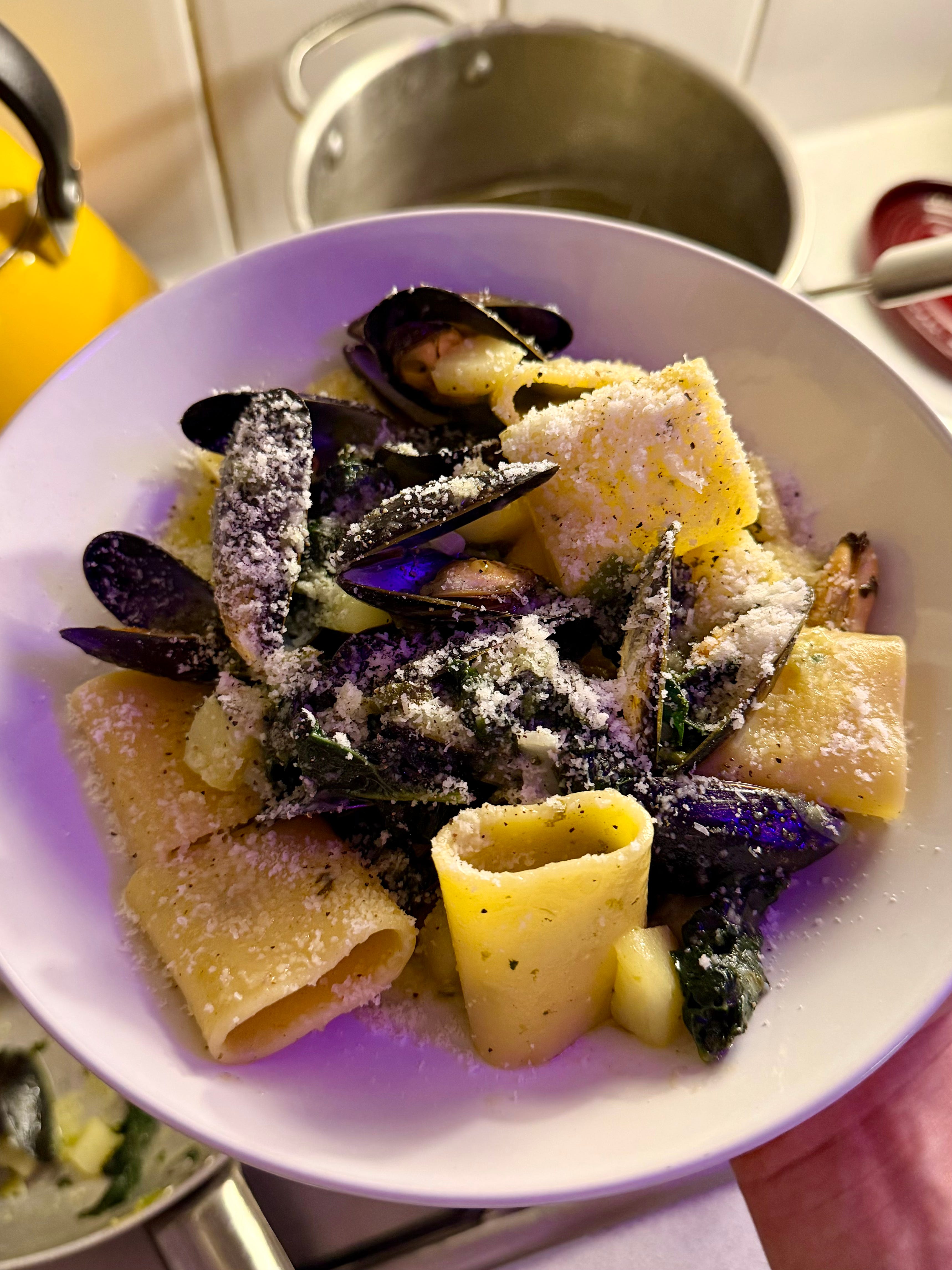 Today we’re making a dish that breaks one of Italian food’s most confidently repeated rules, and does so with the full backing of several centuries of traditional southern cooking. There will be mussels. There will be cheese. Everyone will survive.